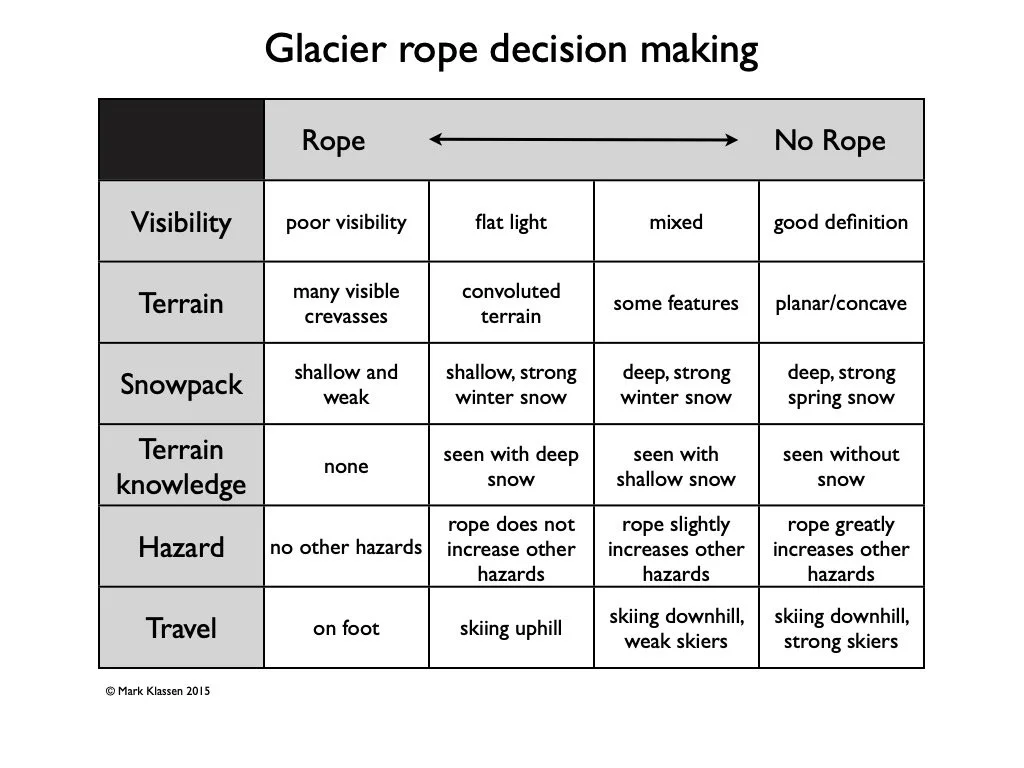 See below for a decision making matrix for skiing unroped on a glacier. Remember, this decision needs to be taken very seriously!